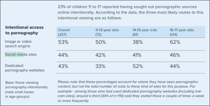 “(according to research published by the BBFC in 2020) only 7% of children who accessed pornography did so through dedicated porn sites….even children intentionally seeking out pornography did so predominantly through social media “